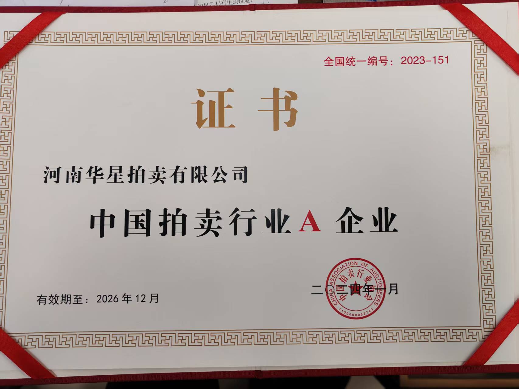 2023年12月我公司經中拍協全國拍賣企業等級評估工作辦公室評為A級企業