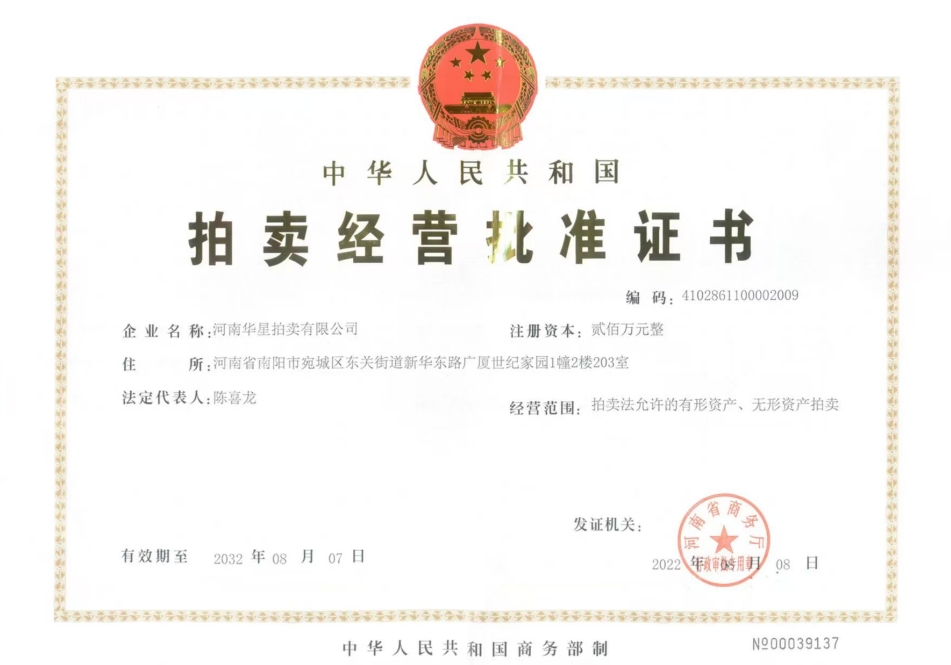 2013年7月取得南陽市人民政府指定、河南省財政廳頒發河南省公物拍賣資格證書